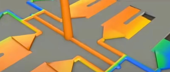 下面我們用顏色來劃分,主流道分流到用顏色劃分,橙色的是溫度高的地方,那么溫度高的地方流動是快的,在它首次分支的時候就是,在這個地方十字分支的時候,它的這個橙色的溫度依然是高溫部分,所以它流動的更快,會導(dǎo)致中間四穴提前打滿,那么邊角的四穴它是藍(lán)色和這個綠色部分,那么它的溫度是低一些的,它流動的就更慢一些,導(dǎo)致流動會不均衡。
